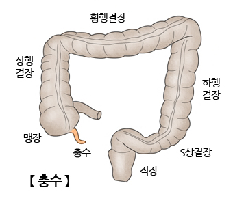 소장과 대장이 이어지는 부위에 주머니처럼 부풀어있는 대장의 부위를 맹장이라고 하는데, 맹장 아래 끝에 위치한 기관을 말합니다. 이 부위에 생긴 염증을 충수염이라고 하는데, 일반적으로 알고 있는 맹장염은 잘못된 용어입니다.