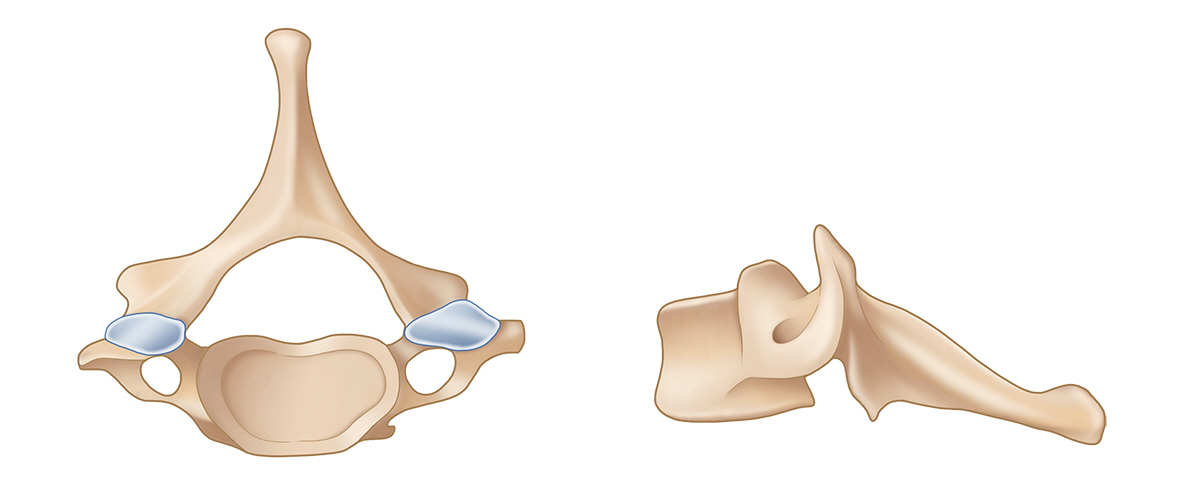 척추는 33개의 뼈로 구성되어 있으며, 척추뼈는 모두 기본적으로 동일한 형태를 가지고 있지만 각각의 위치에 따라 형태와 기능을 달리 합니다. 그 중 7개의 척추로 이루어진 경추는 전체적으로 C자 모양을 하고 있어 흉추나 요추 등 척추의 다른 부분에 비해 움직임이 용이합니다. 경추의 윗부분은 두개골과, 아래부분은 흉추와 연결되어 있습니다.